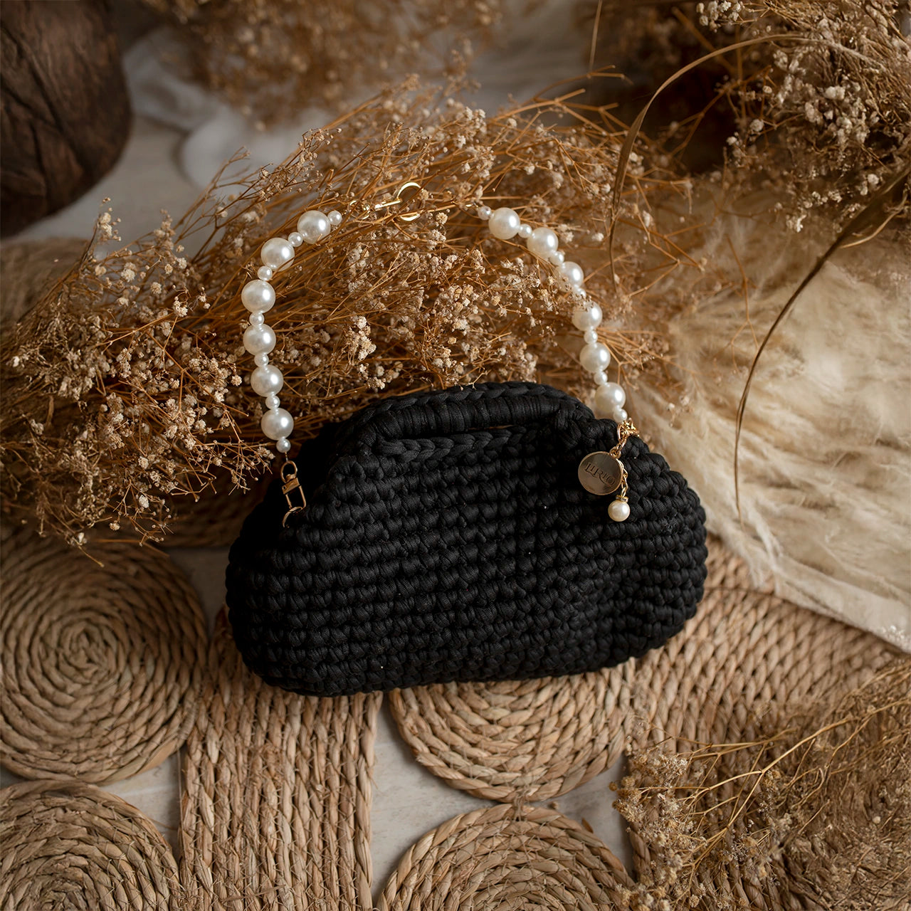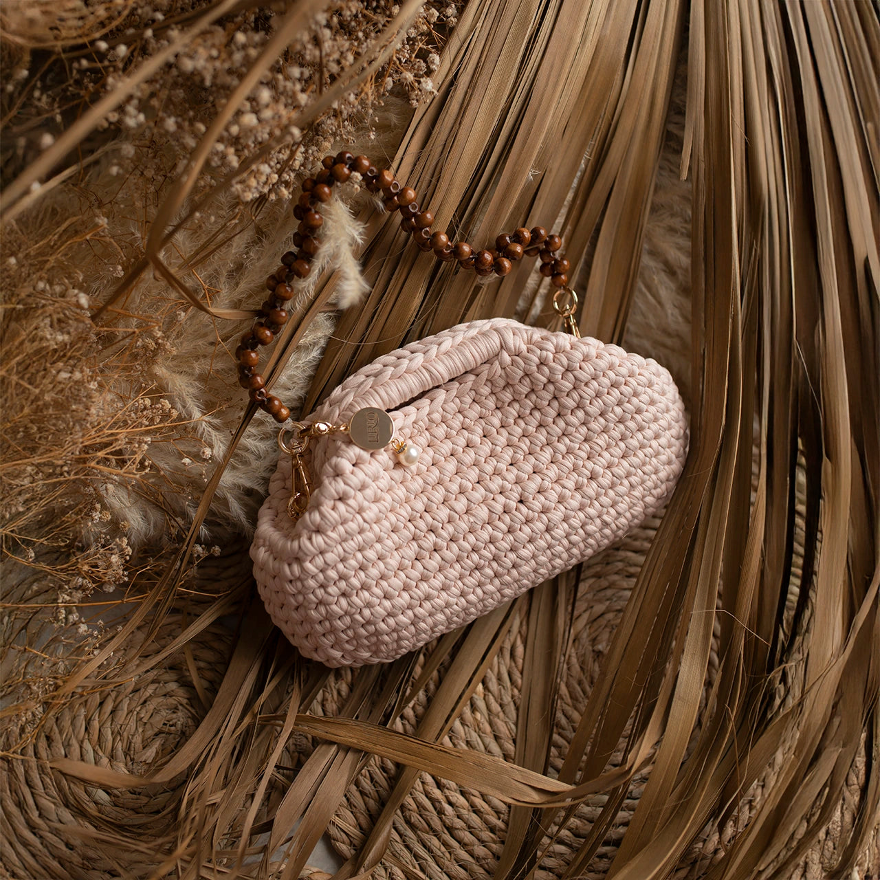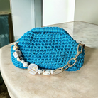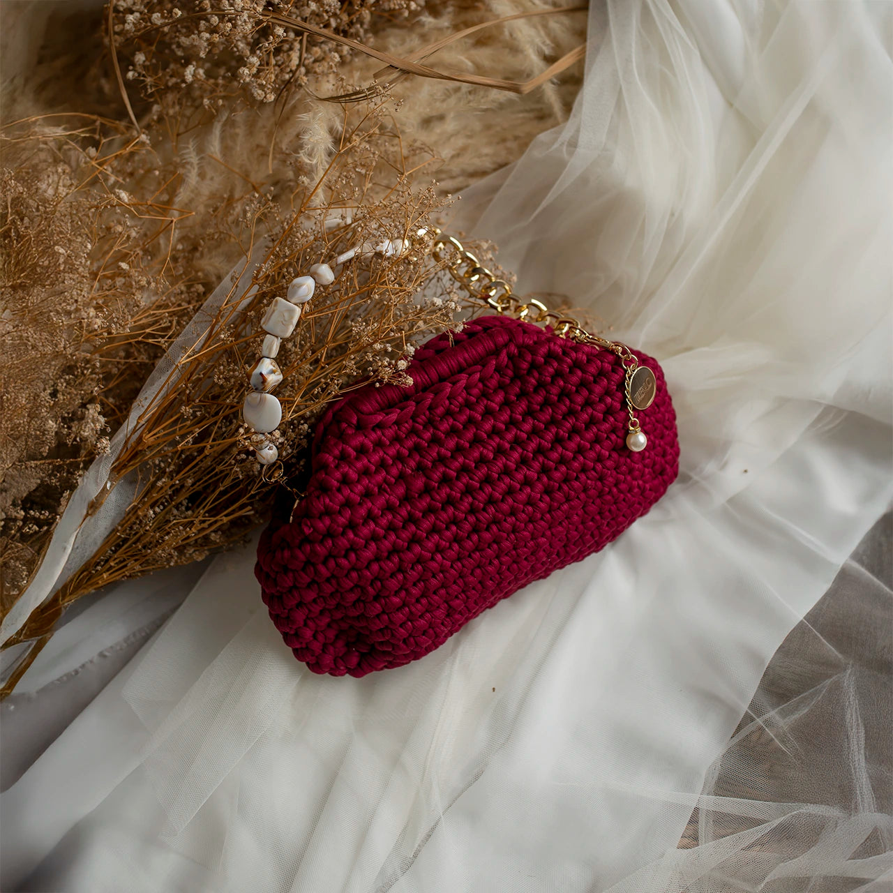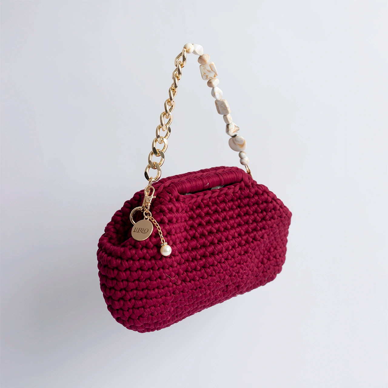 The Alissa is a hand-crocheted mini bag with wolf's mouth opening featuring elegant gold or beaded chain options. Available in a variety of colors, it's the perfect mix of playful and polished for day-to-night wear.