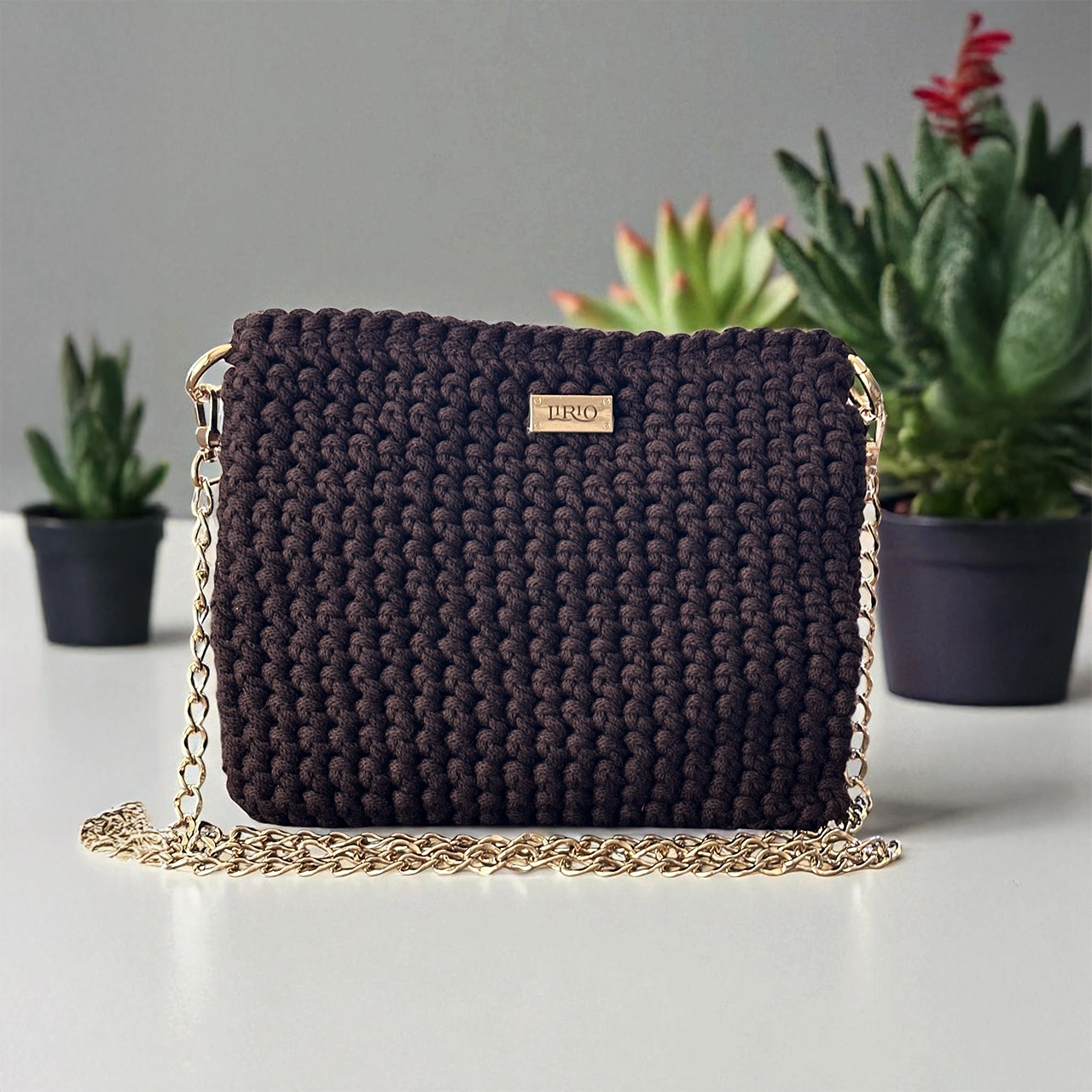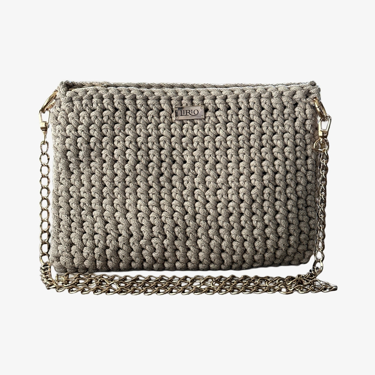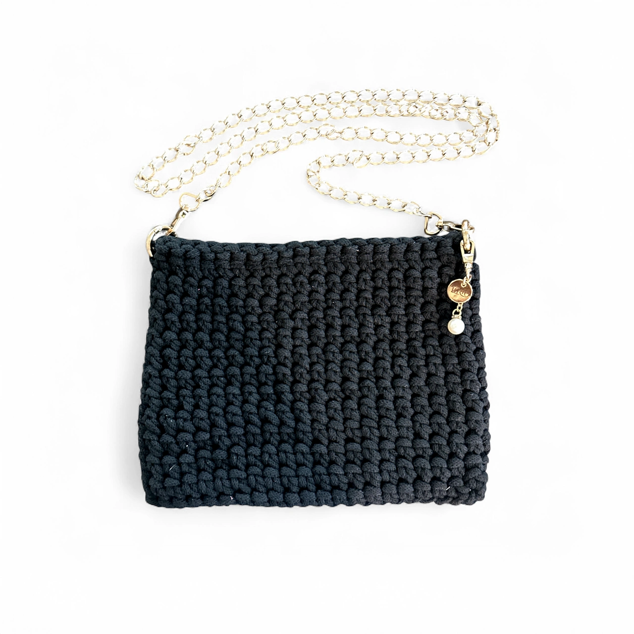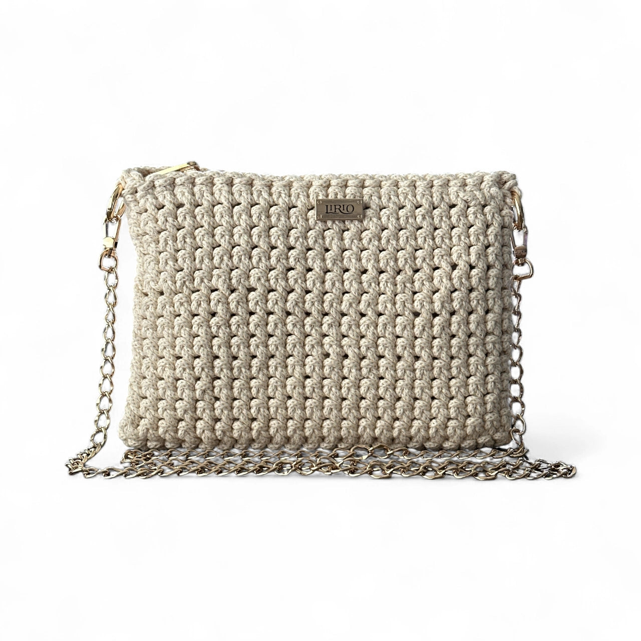 The Alma bag is a minimalist crochet crossbody designed for everyday use. Handwoven with a tight, uniform stitch, its rectangular shape gives it a clean and structured look. A lightweight gold-tone chain strap adds versatility, allowing it to be worn over the shoulder or across the body. Compact yet roomy enough for your essentials, Alma is a simple, practical choice with a handcrafted touch.