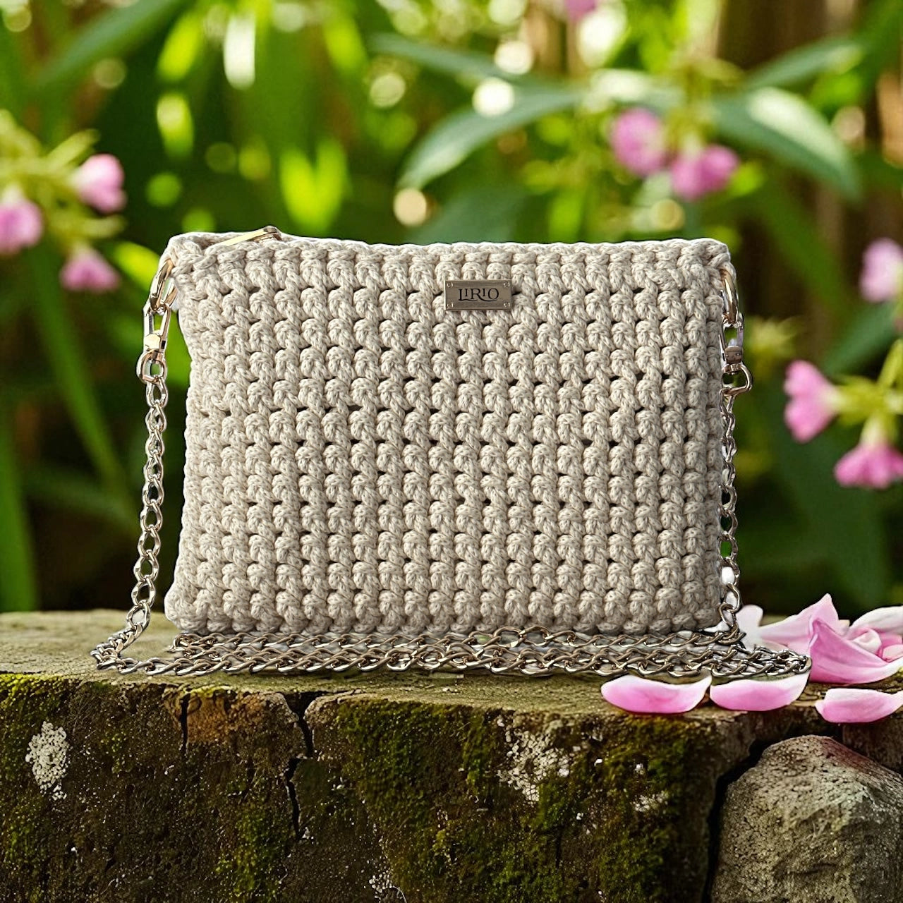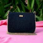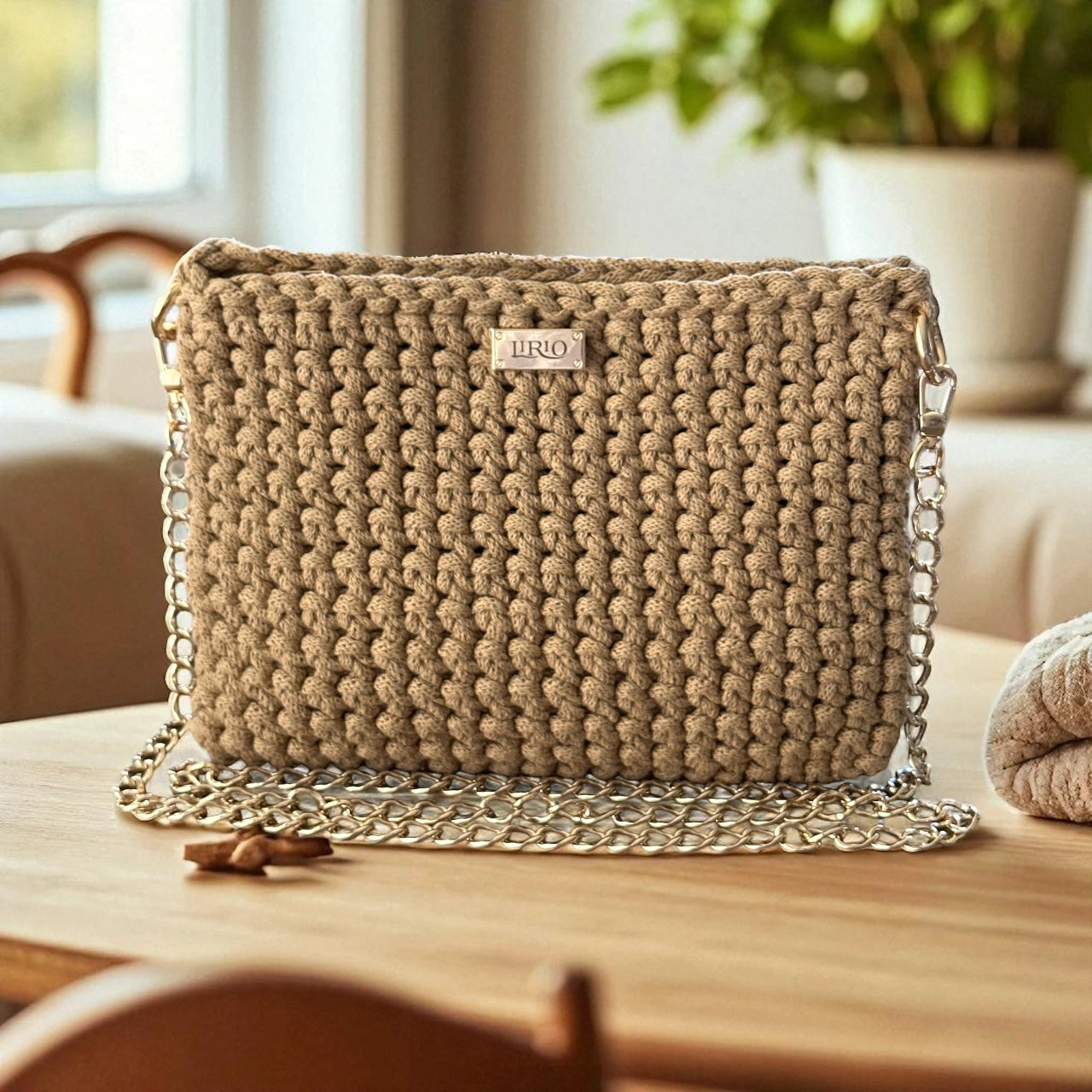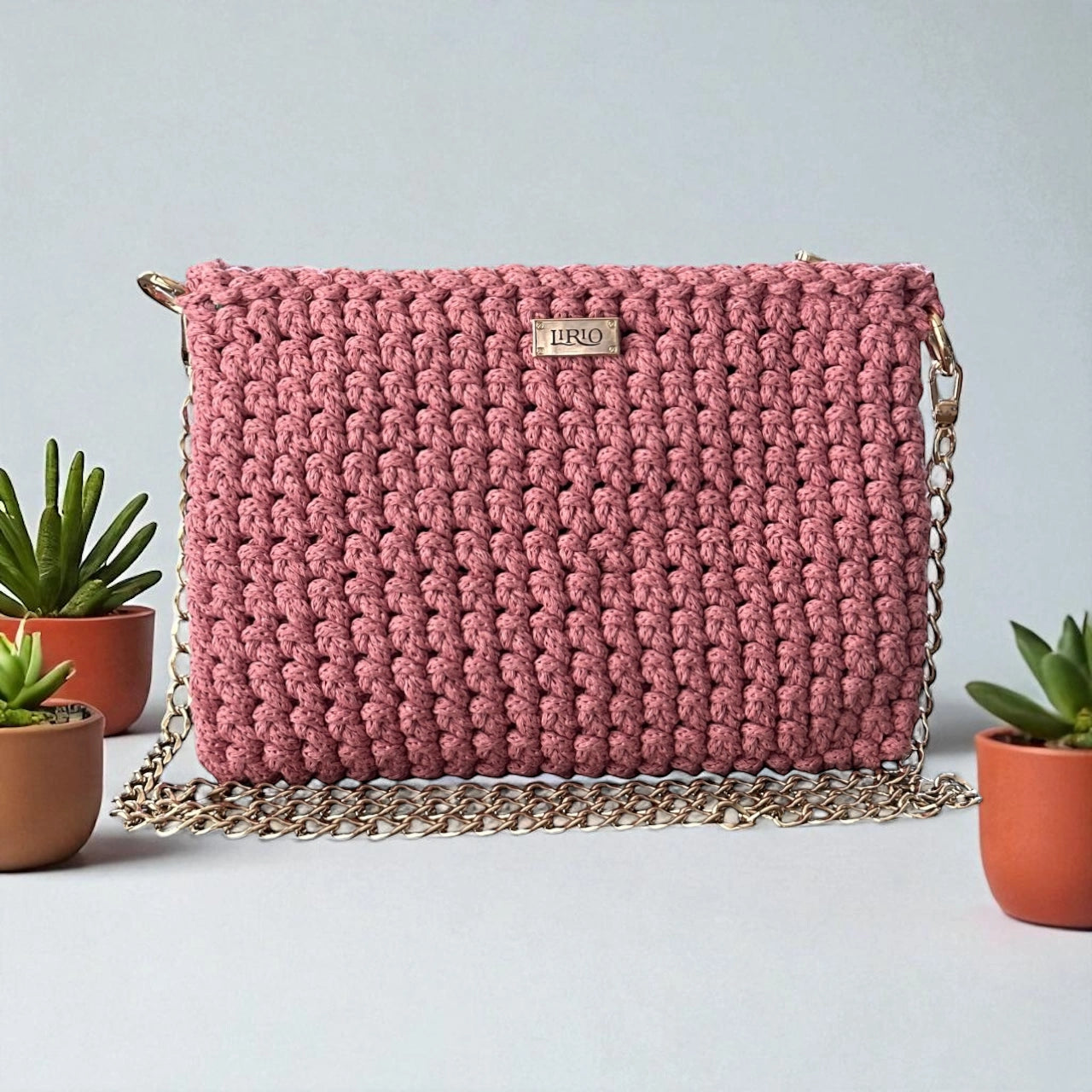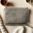 The Alma bag is a minimalist crochet crossbody designed for everyday use. Handwoven with a tight, uniform stitch, its rectangular shape gives it a clean and structured look. A lightweight gold-tone chain strap adds versatility, allowing it to be worn over the shoulder or across the body. Compact yet roomy enough for your essentials, Alma is a simple, practical choice with a handcrafted touch.