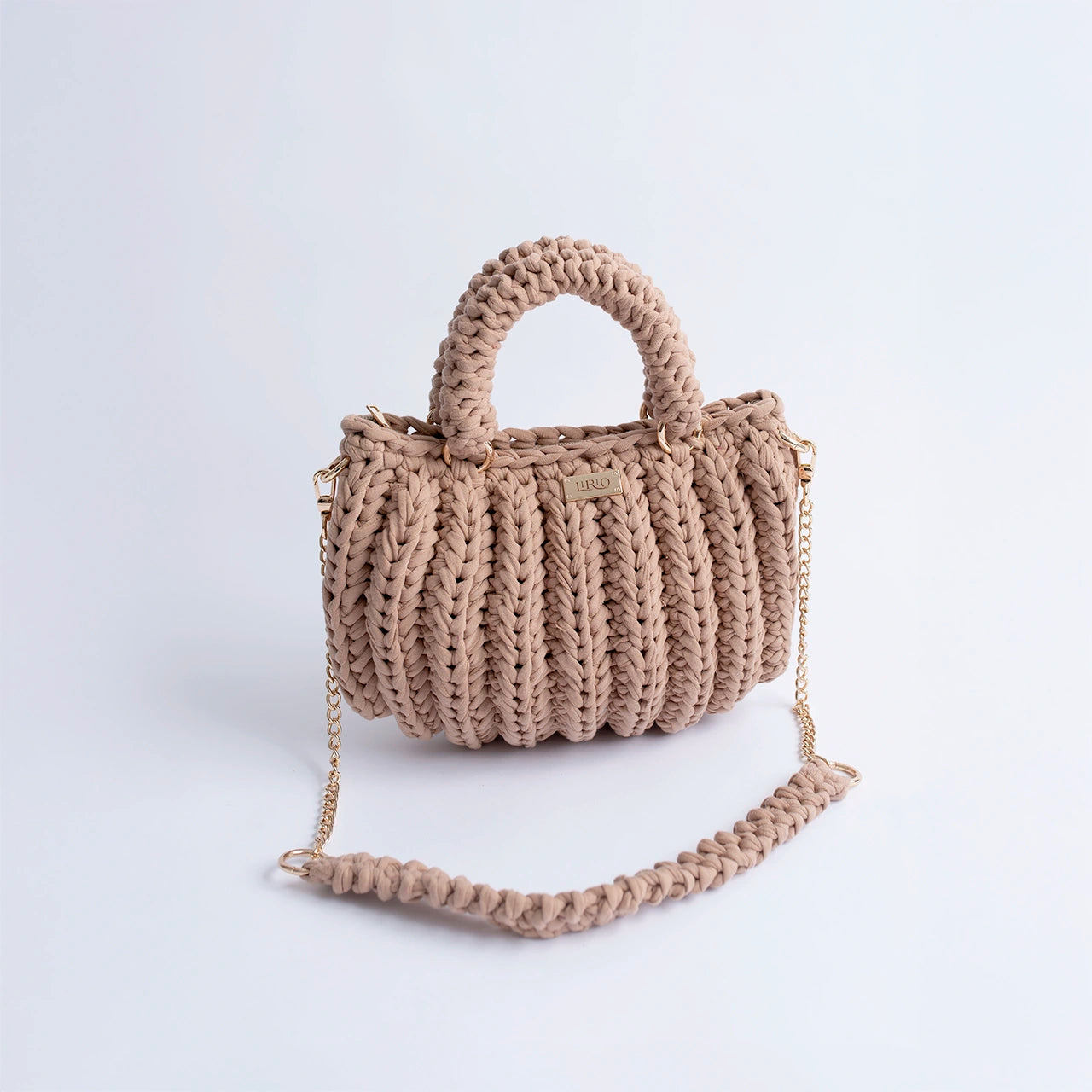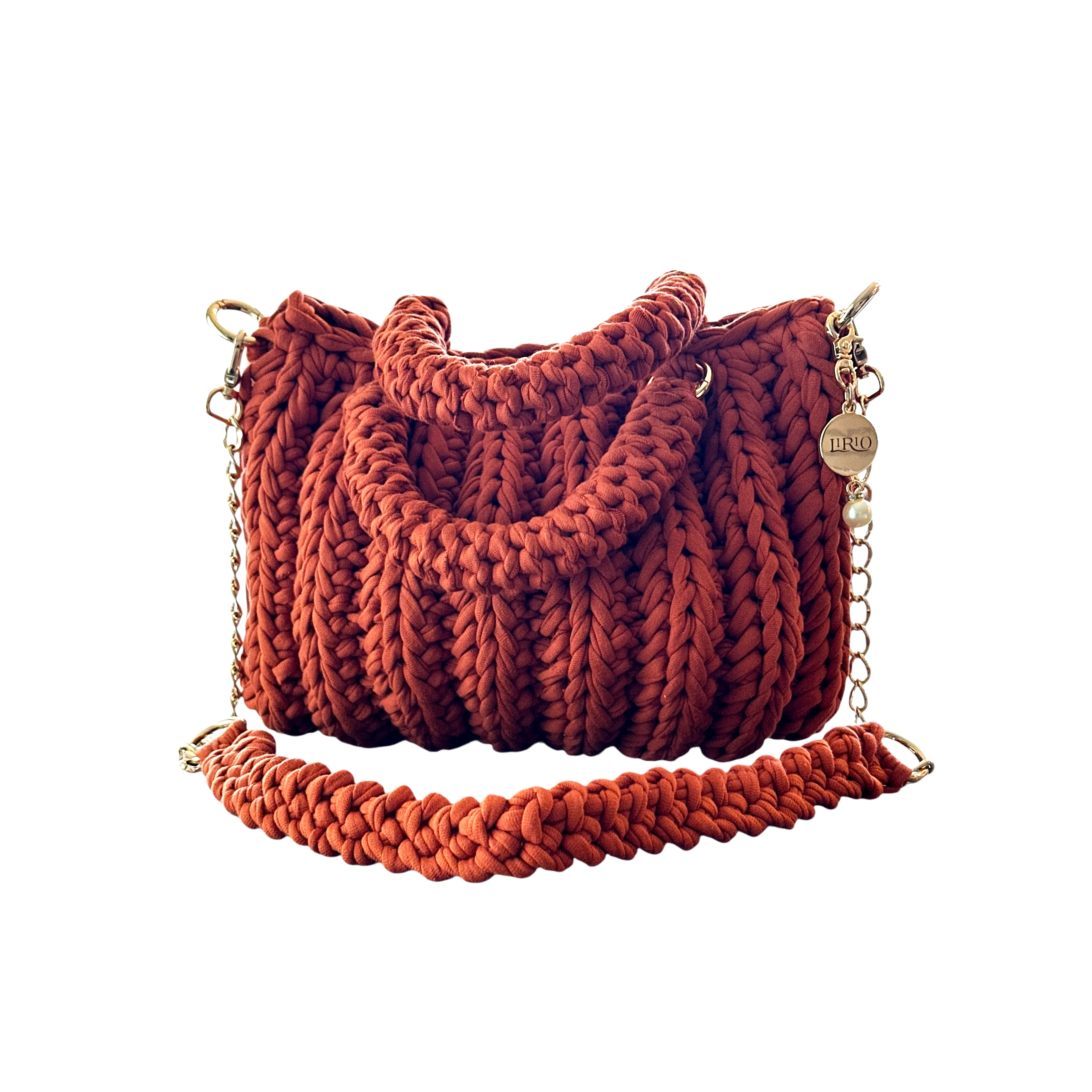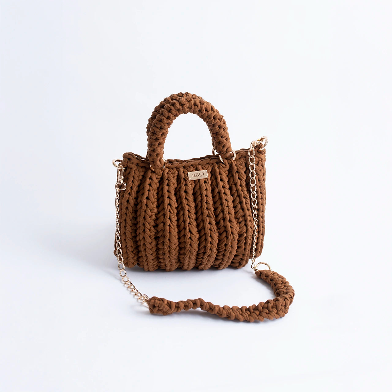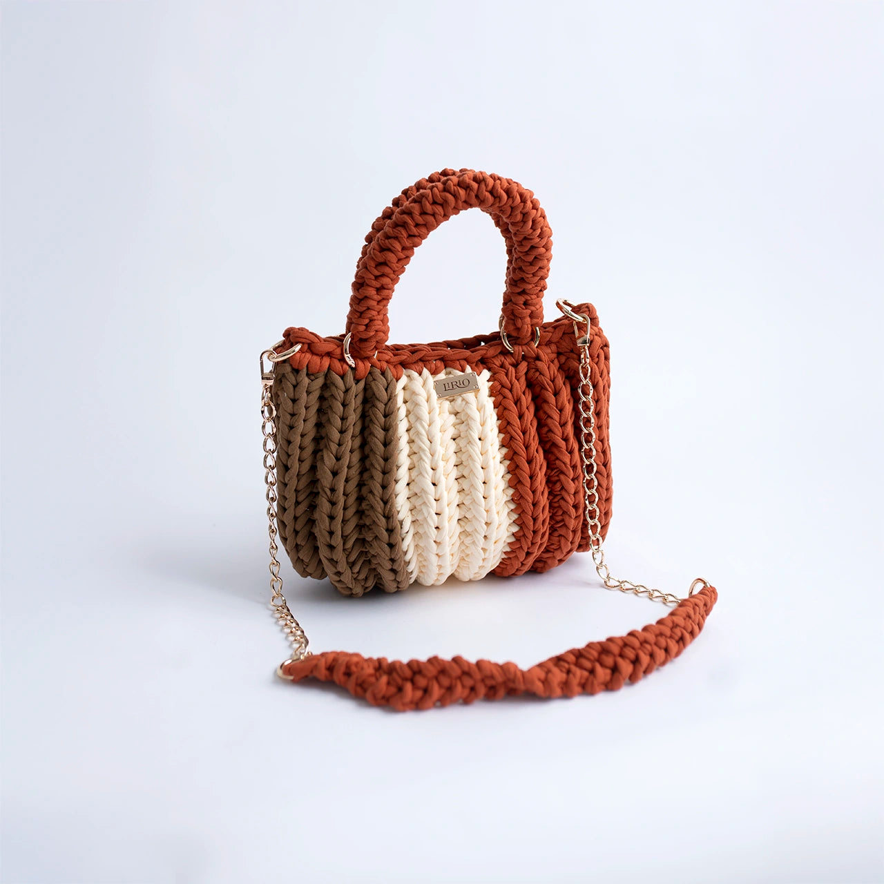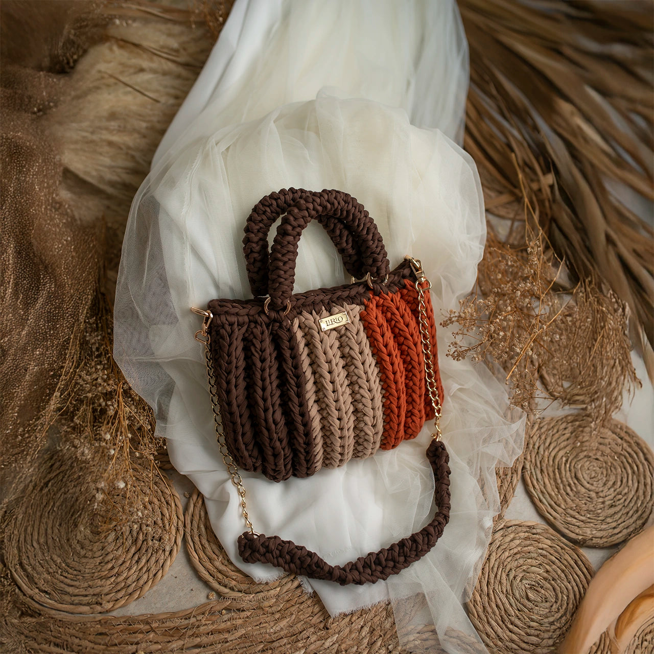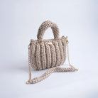 The Lari is a bold, structured handbag crafted with thick crochet stitching for added texture and durability. It features sturdy rounded handles, a matching woven shoulder strap, and a gold-tone chain for versatile wear.