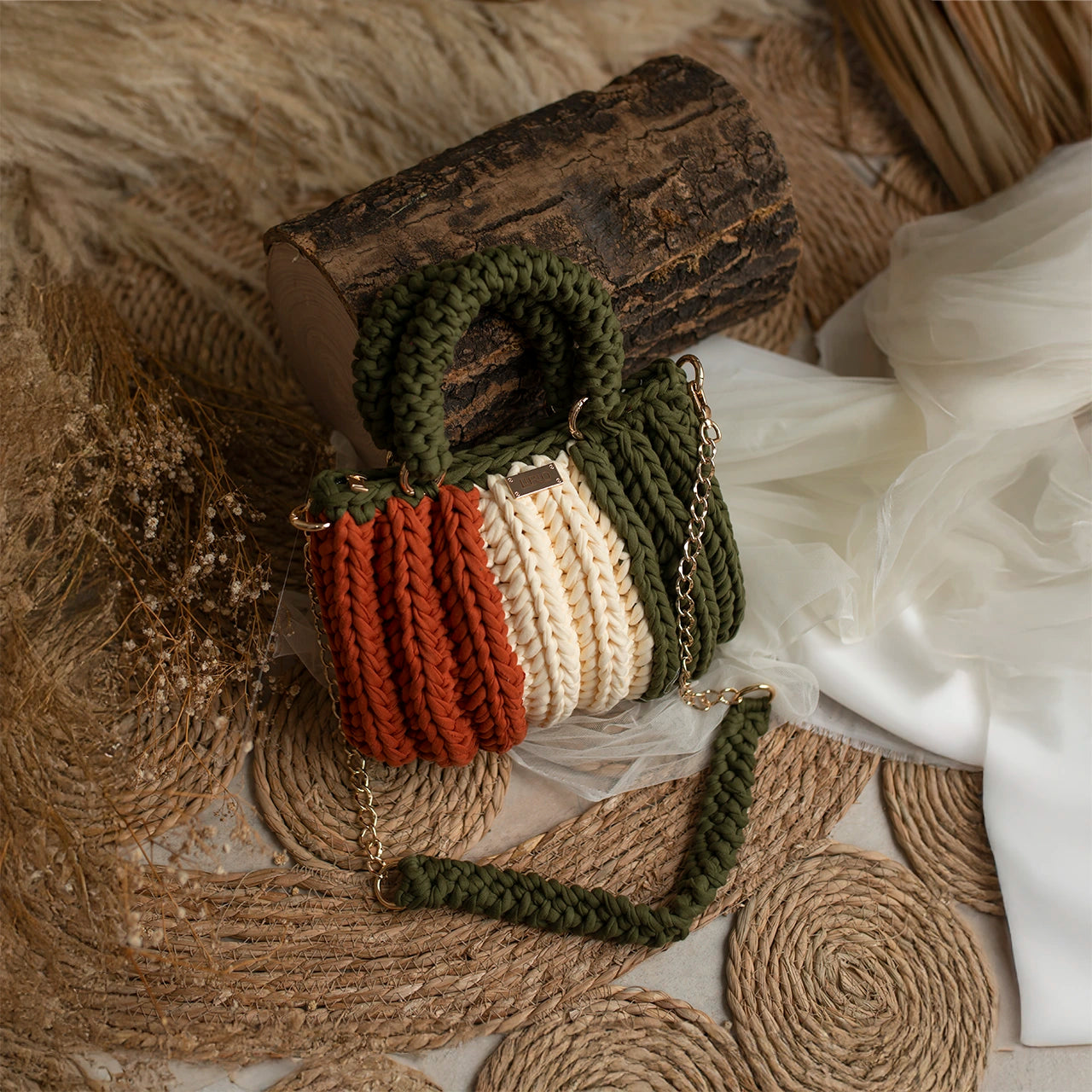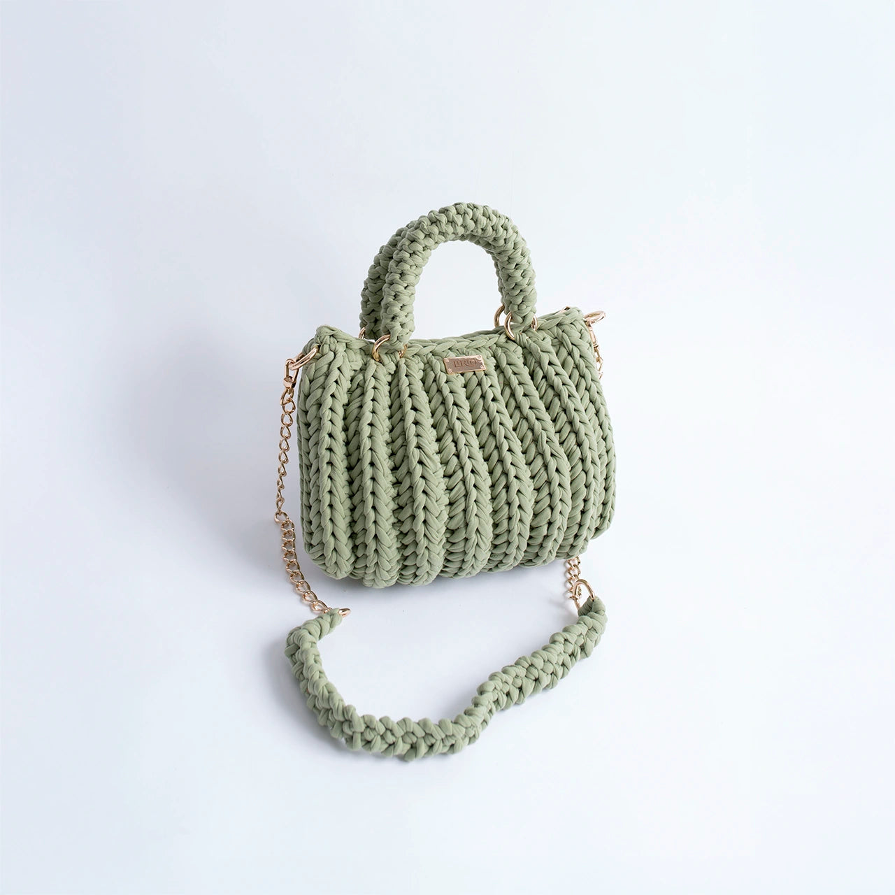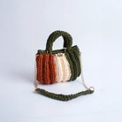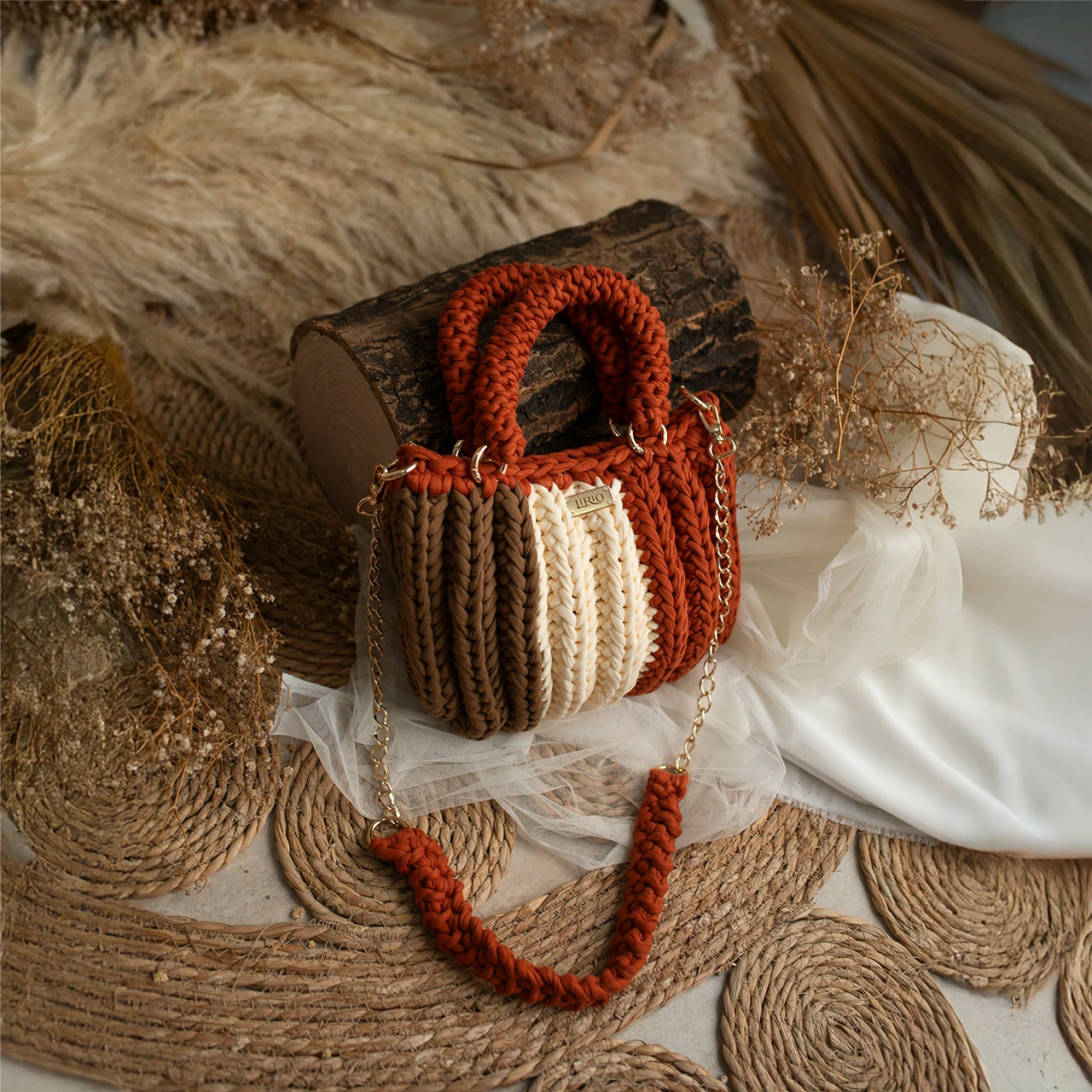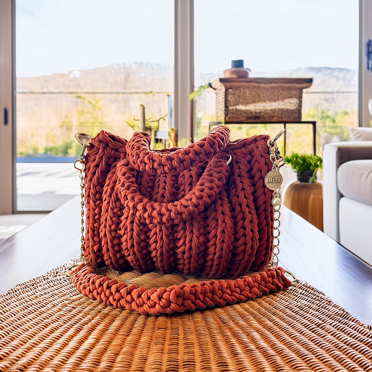 The Lari is a bold, structured handbag crafted with thick crochet stitching for added texture and durability. It features sturdy rounded handles, a matching woven shoulder strap, and a gold-tone chain for versatile wear.