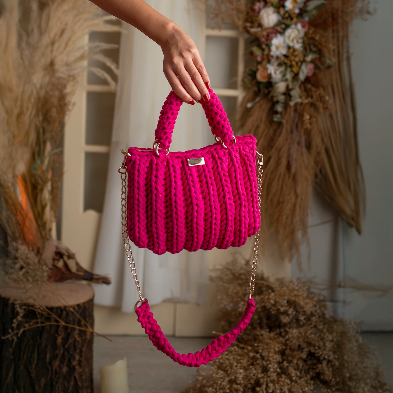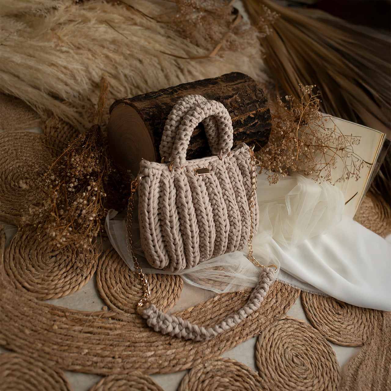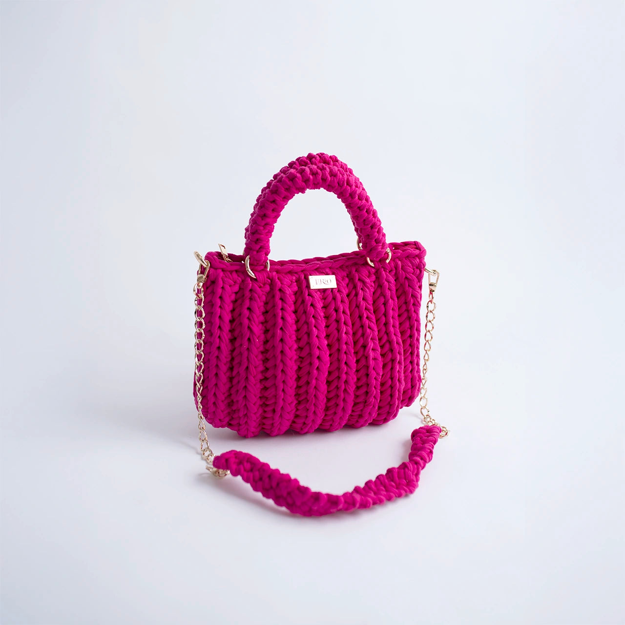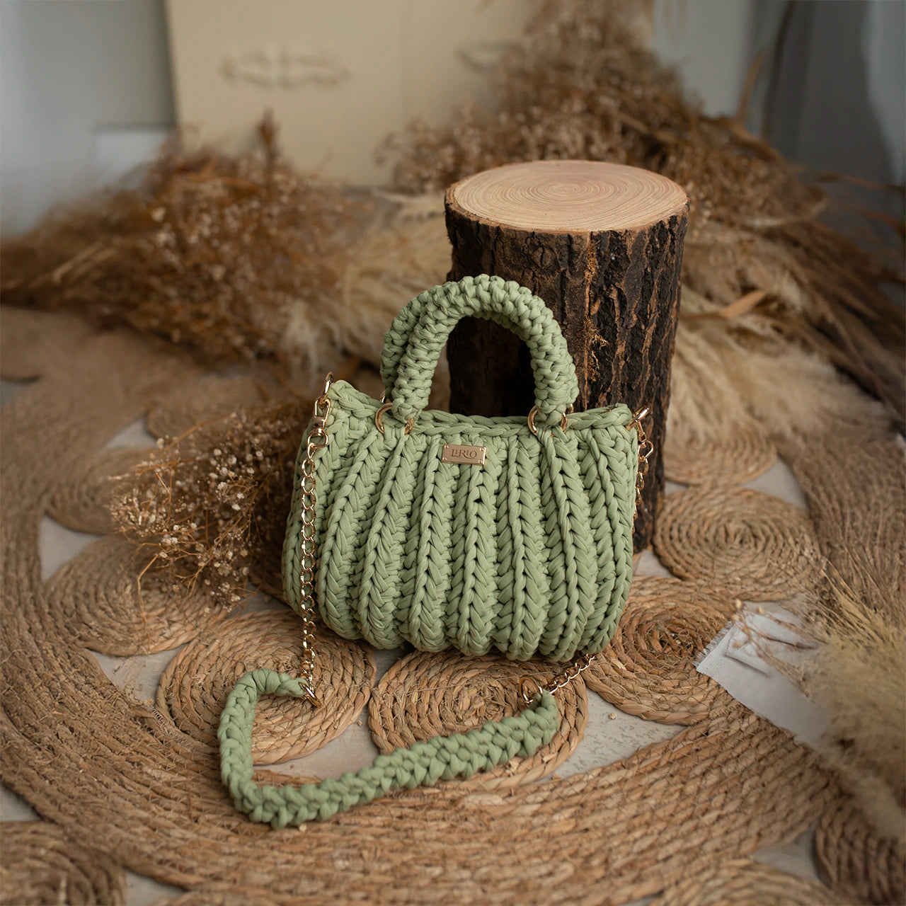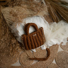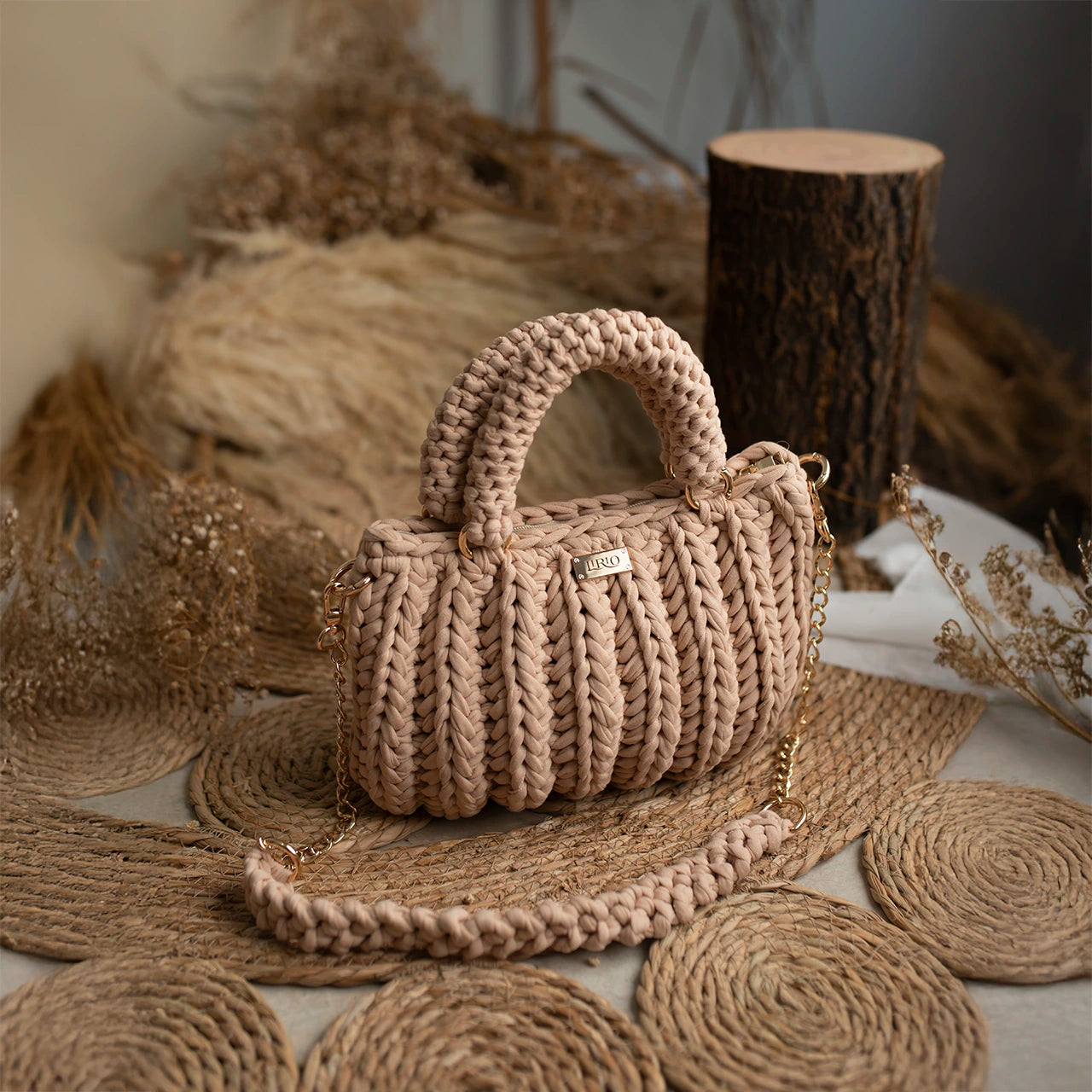 The Lari is a bold, structured handbag crafted with thick crochet stitching for added texture and durability. It features sturdy rounded handles, a matching woven shoulder strap, and a gold-tone chain for versatile wear.