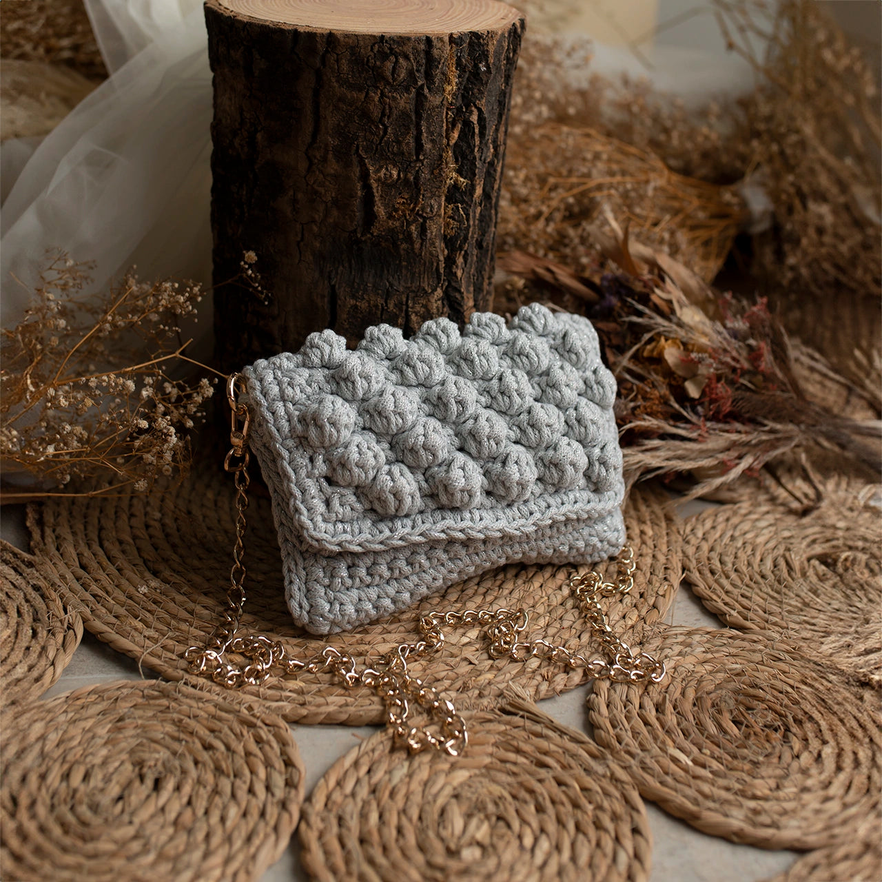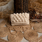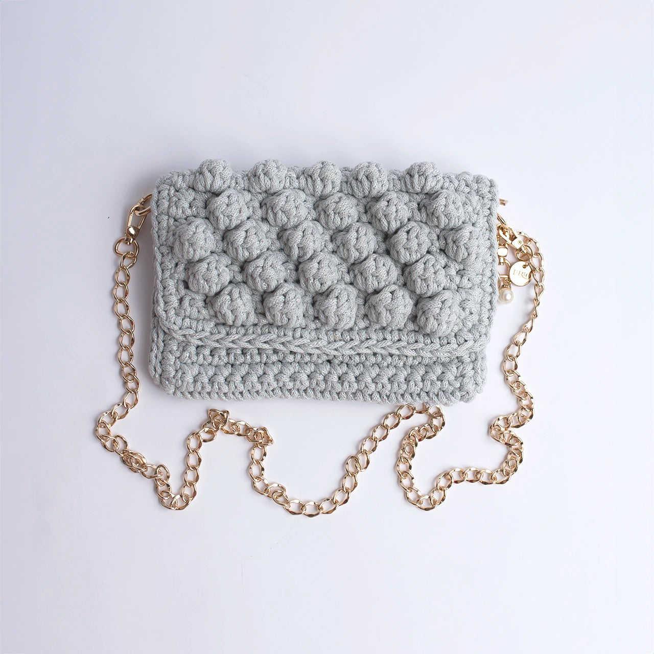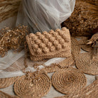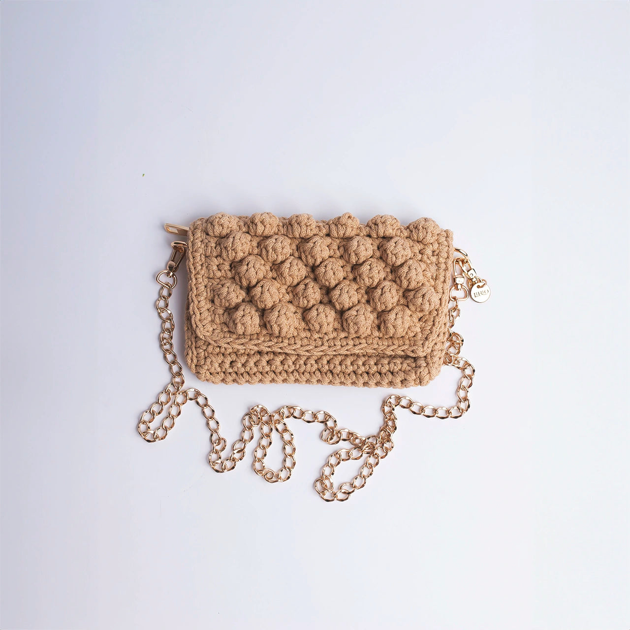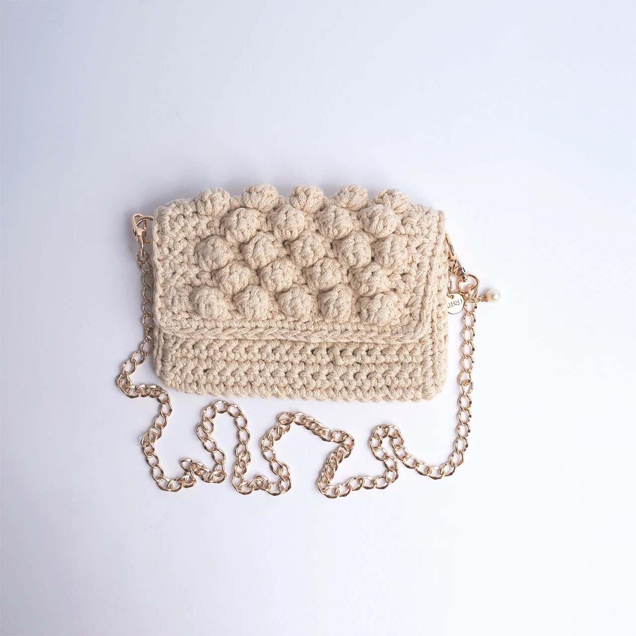 Small in size, bold in texture—the Lucia bag is a handwoven crossbody bag using natural fibers and a popcorn stitch. A detachable gold-tone chain adds versatility—wear it as a crossbody, shoulder bag, or clutch.