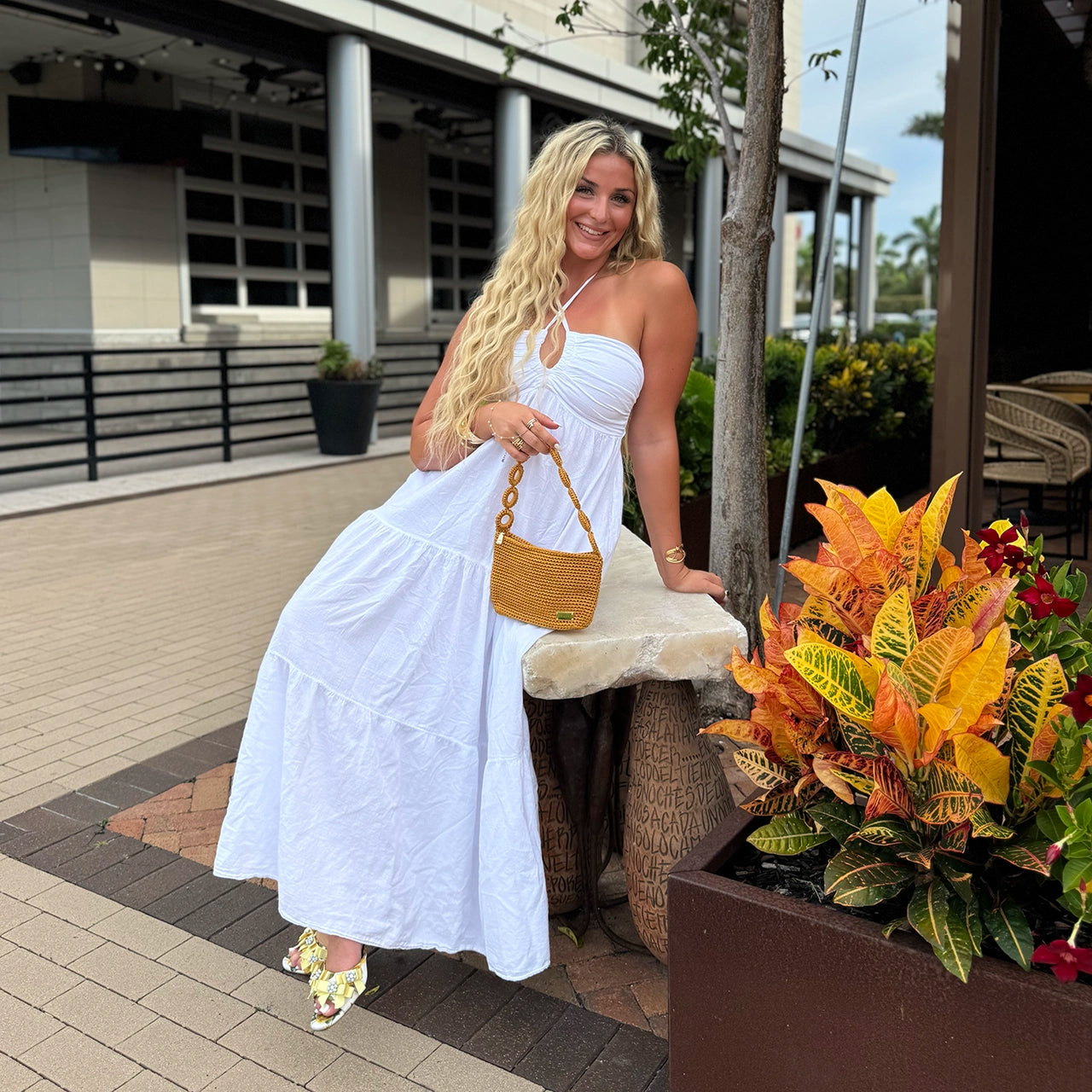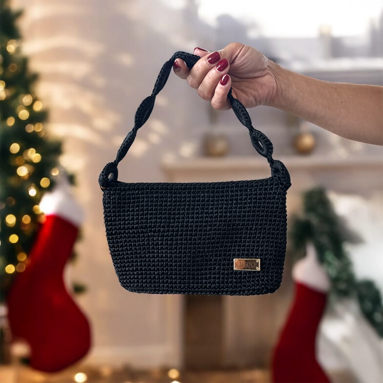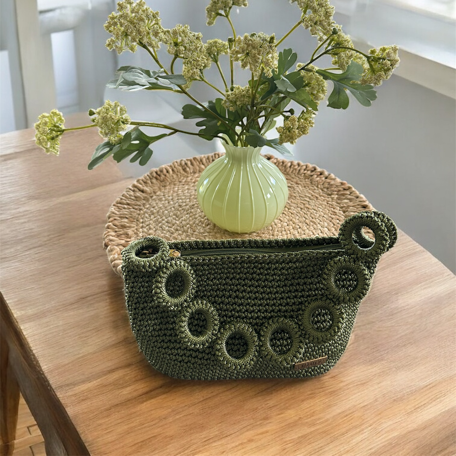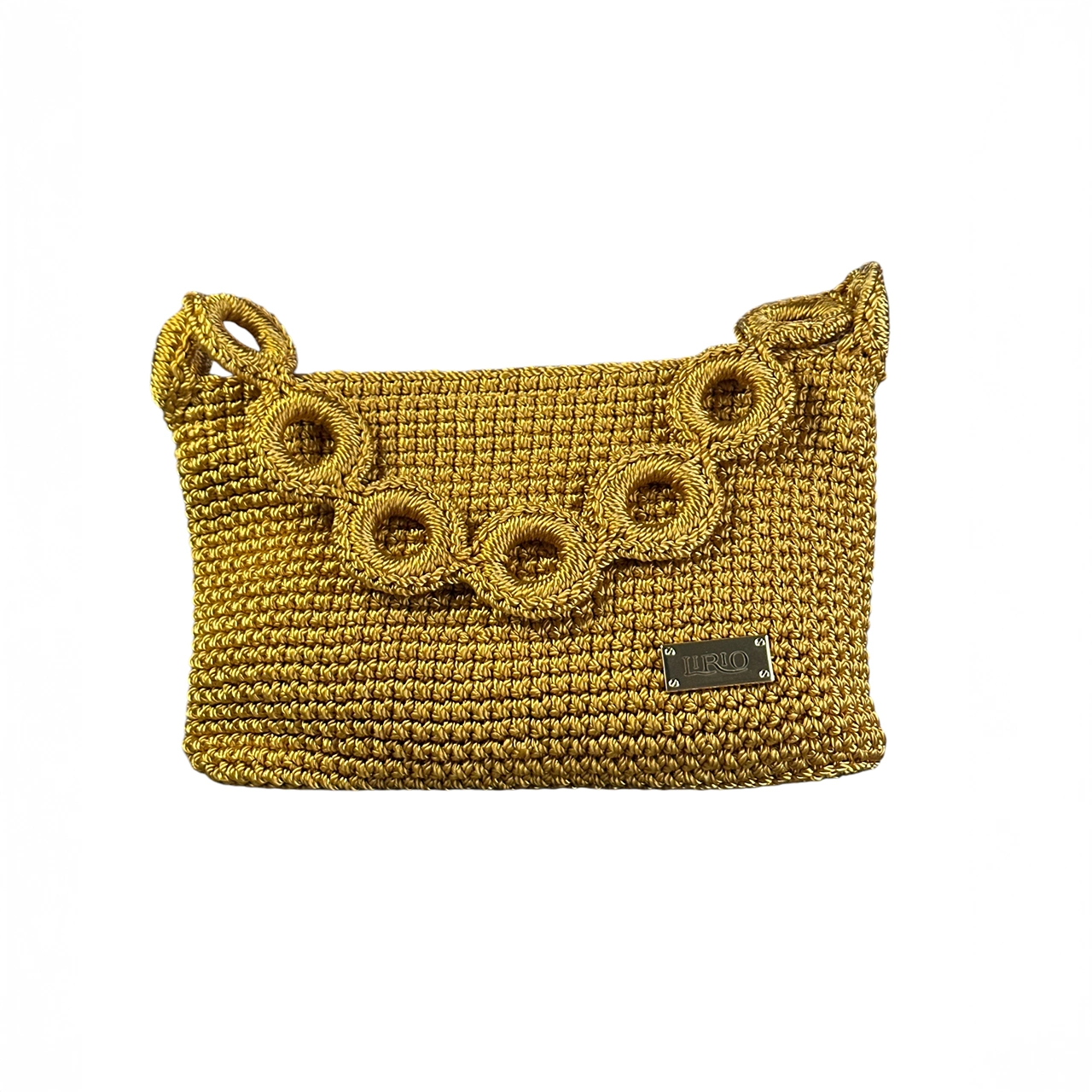 Handwoven with a shiny thread and a tight weave, this medium-sized shoulder bag features a row of statement ring accents on the handle. The simple silhouette makes it versatile for everyday wear, while the bold details ensure it stands out in any outfit.