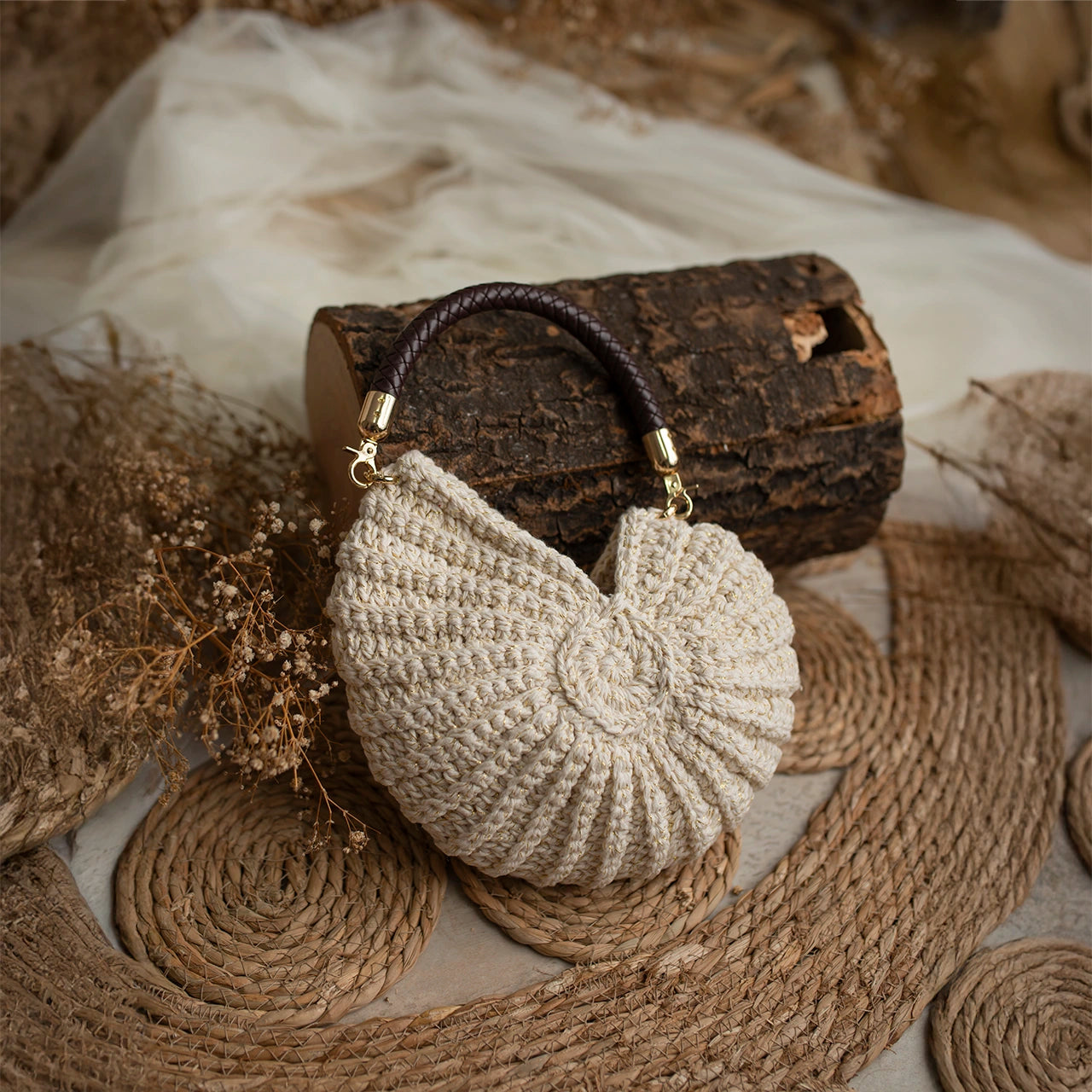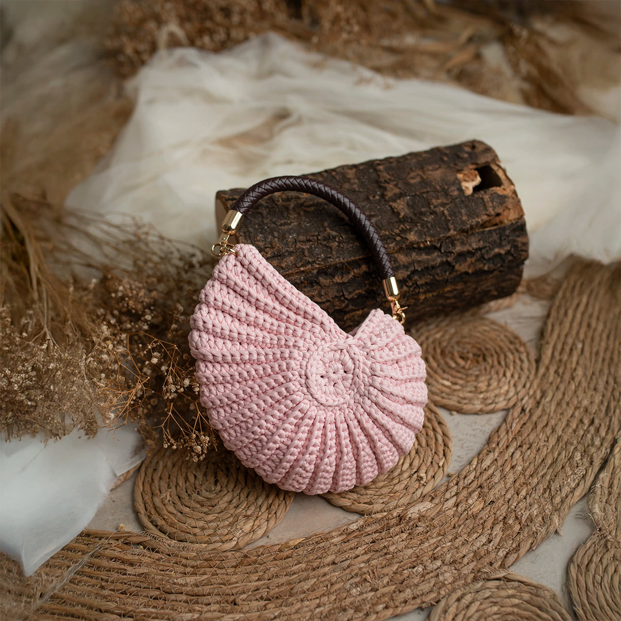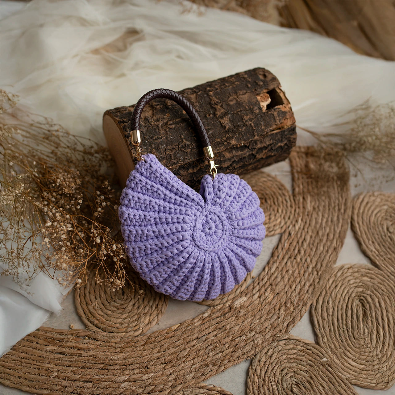 Inspired by ocean waves and coastal charm, the Shella Bag features a unique shell-inspired shape, perfect for adding a playful yet refined twist to your look. Made from durable crochet yarn and finished with a textured faux-leather handle, this lightweight bag is compact and easy to carry by hand or on your wrist.