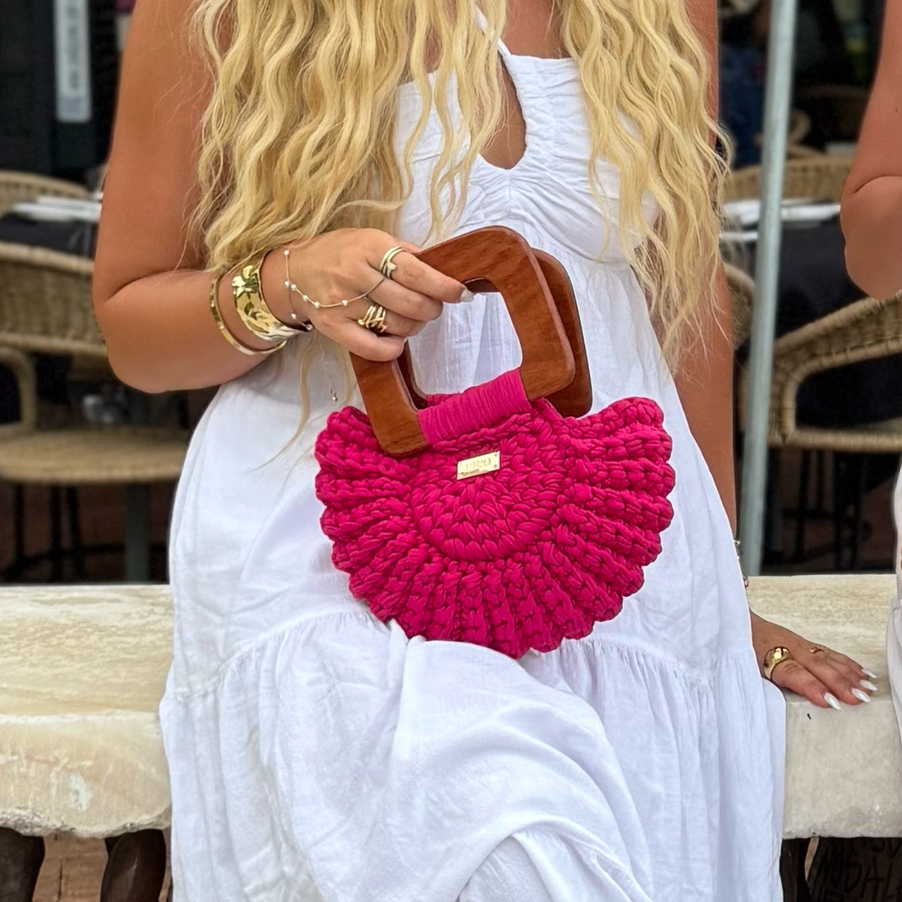 Handcrafted with care, this elegant half-moon crochet bag blends timeless artisanal charm with modern versatility. Designed with smooth wooden handles for a chic, natural touch, it can be carried as a sophisticated clutch.