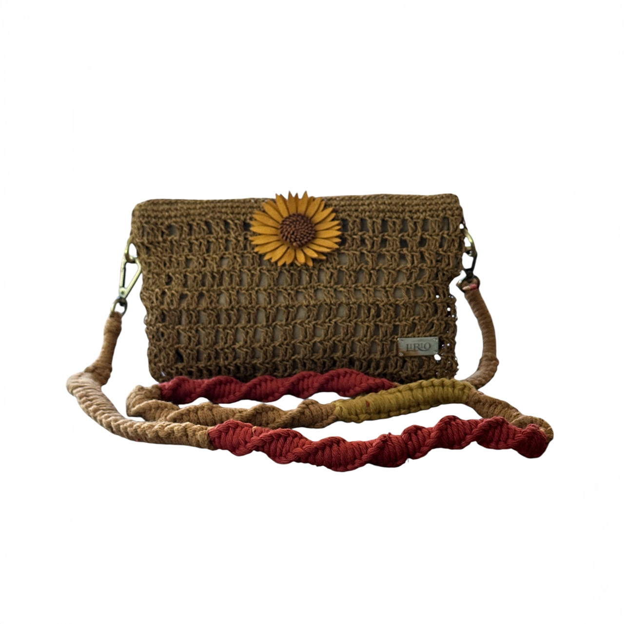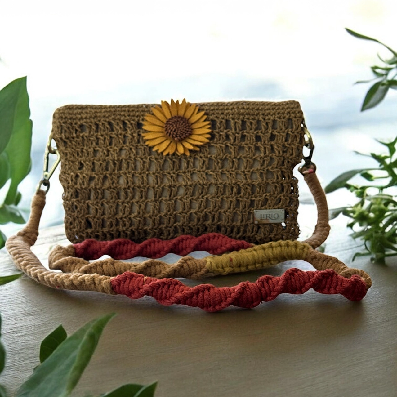 Sunflower Bloom – Features a hand-applied sunflower accent on the front and a multicolor twisted strap in earthy red, mustard, and beige tones.