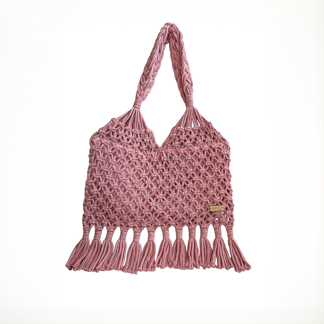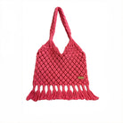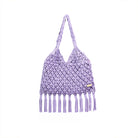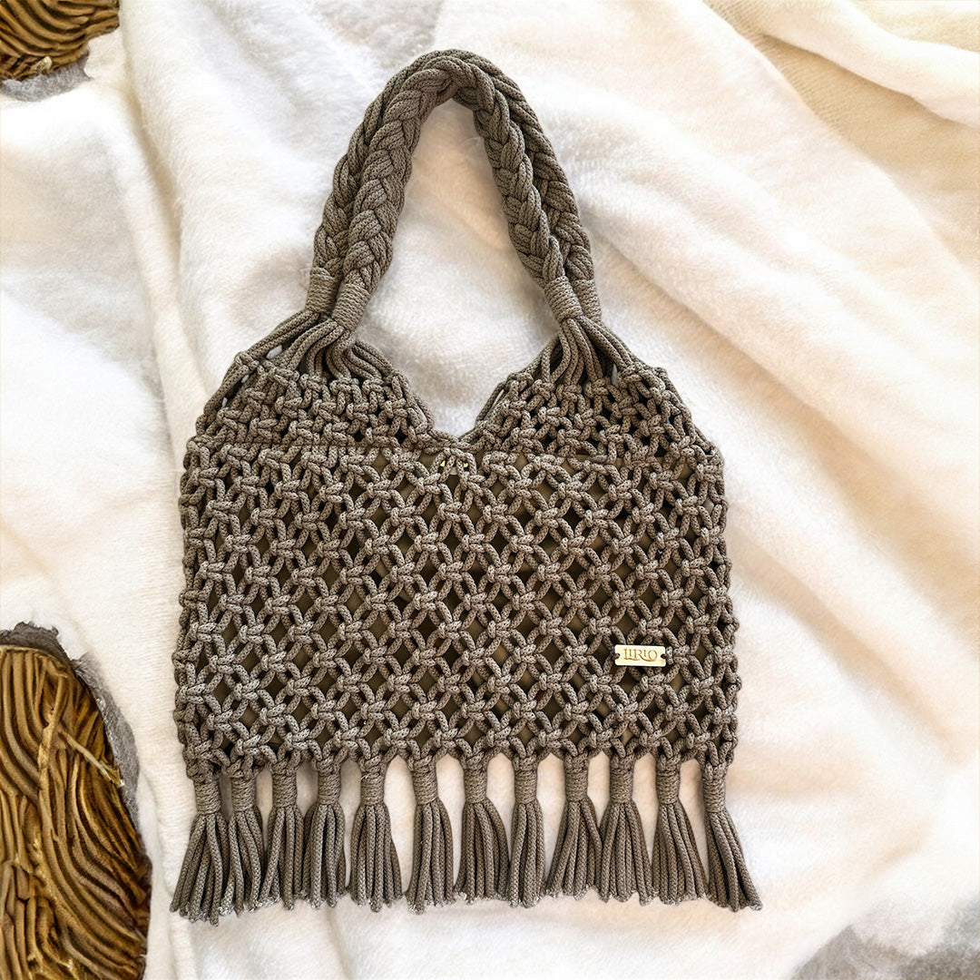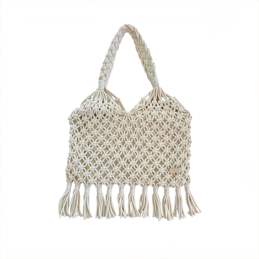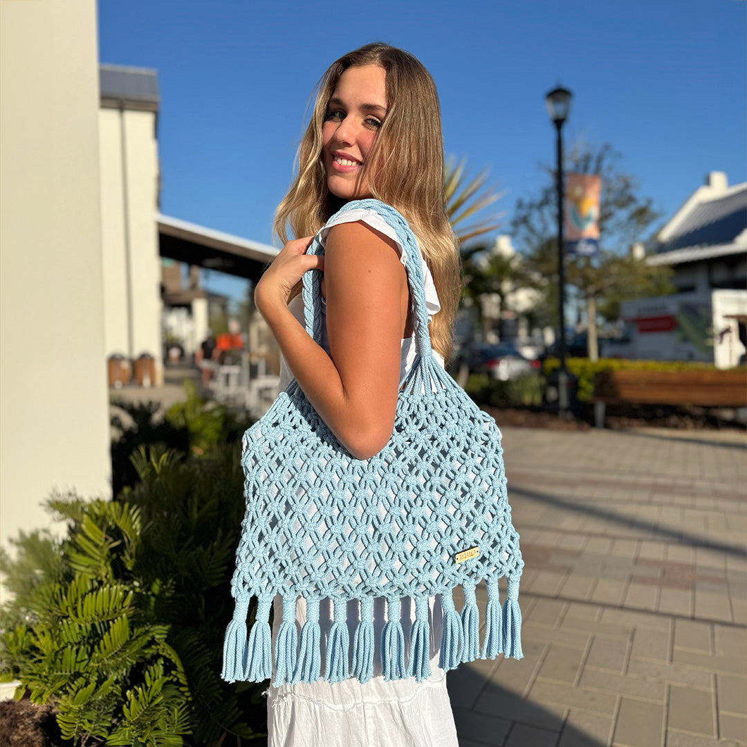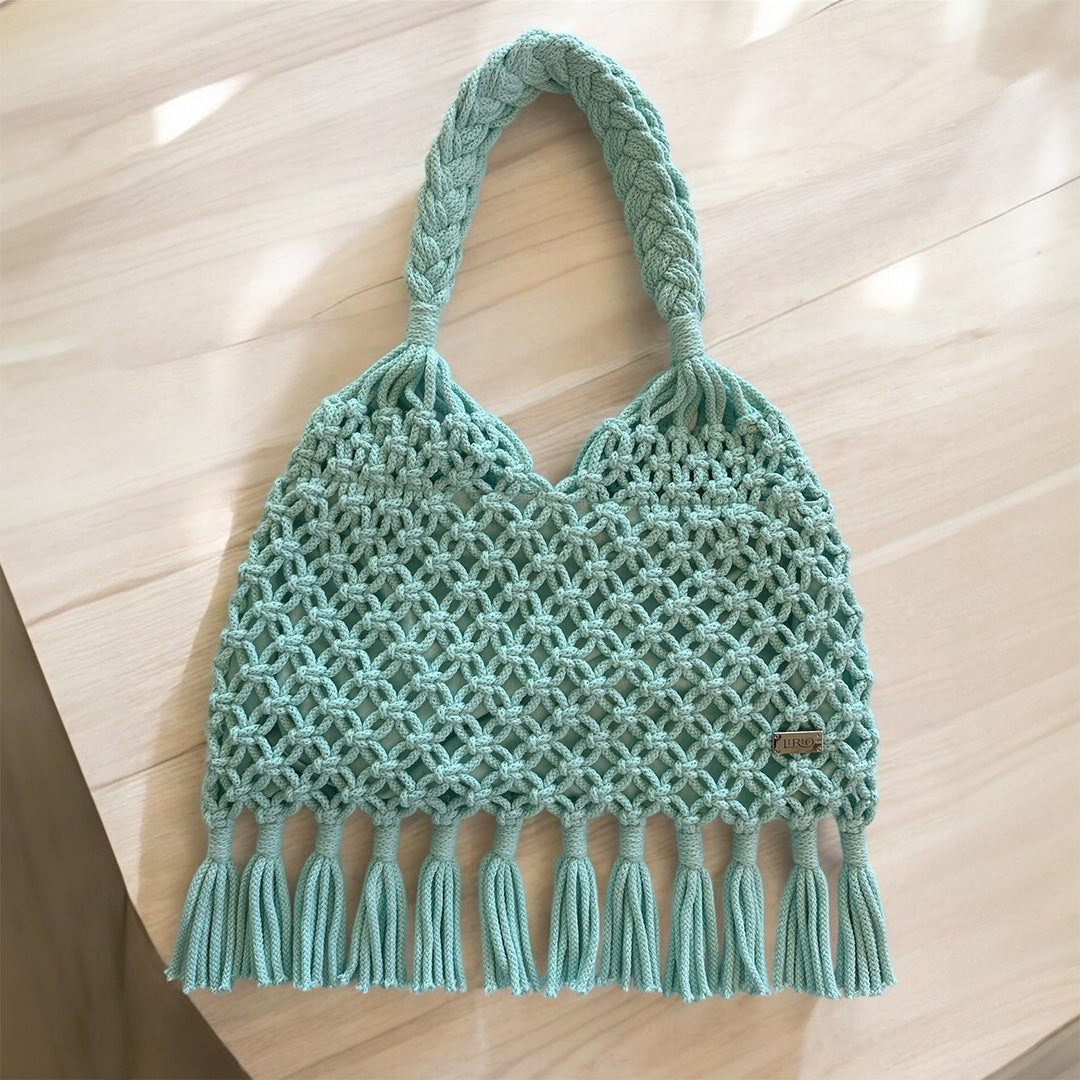 The Clara bag is a handwoven macramé handbag designed with an open diamond knot pattern and tassel details along the bottom edge. Its braided handles provide a comfortable grip, while the lightweight structure makes it easy to carry for casual outings, markets, or beach days. The handcrafted texture gives it a relaxed yet stylish look that pairs effortlessly with warm-weather outfits.