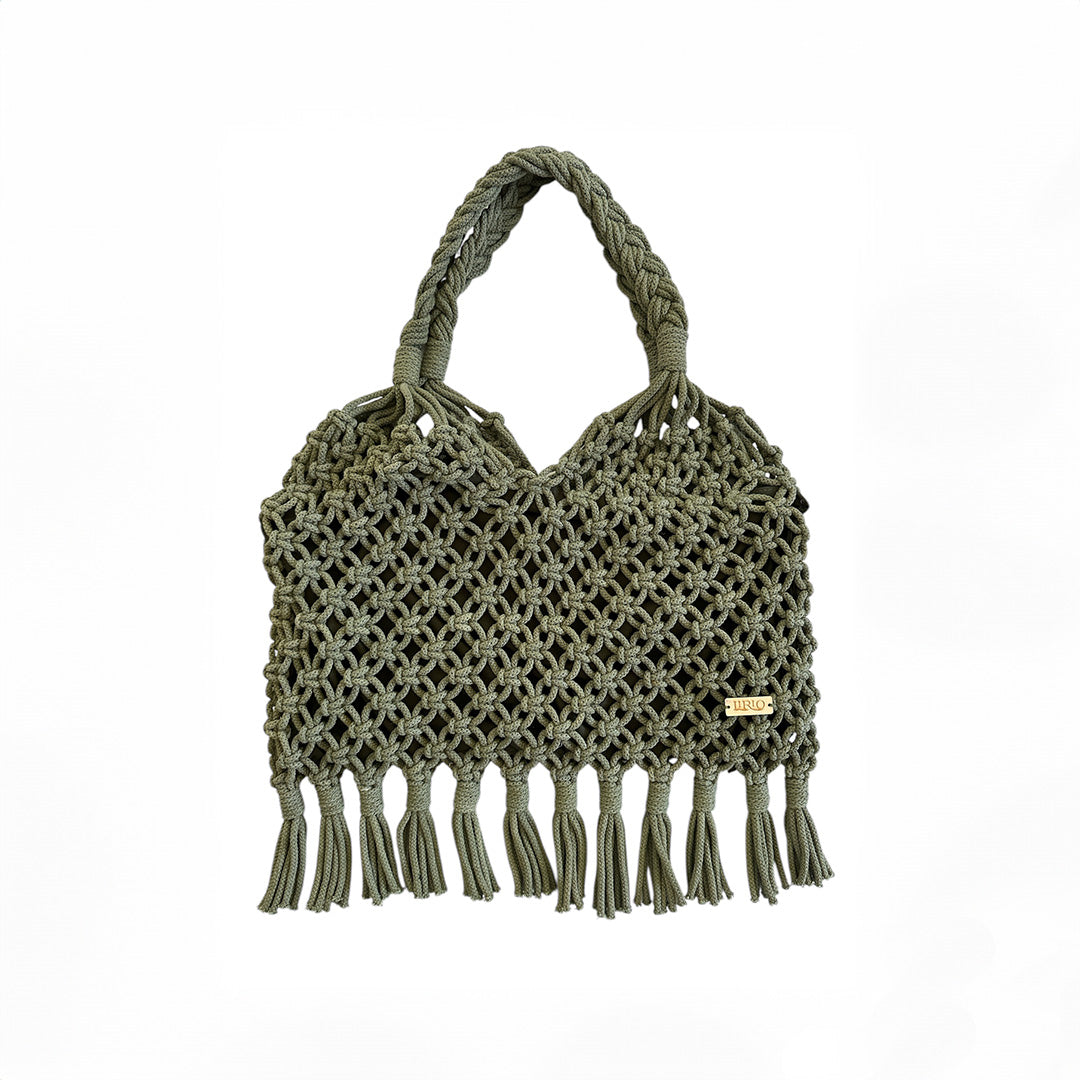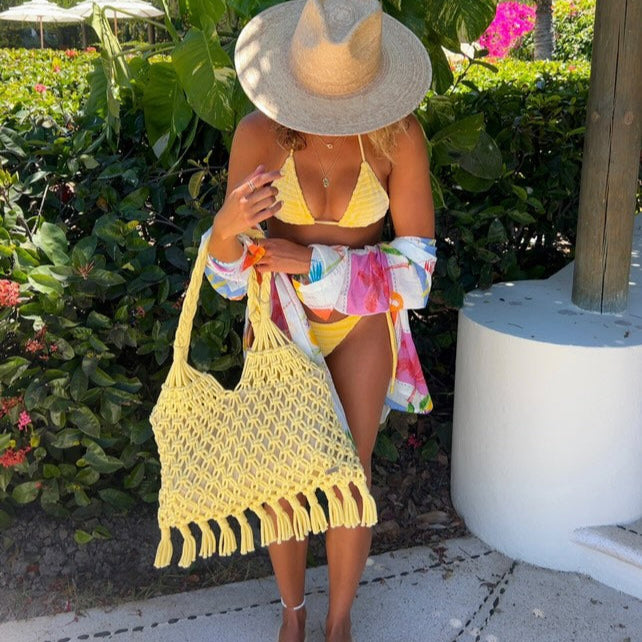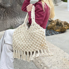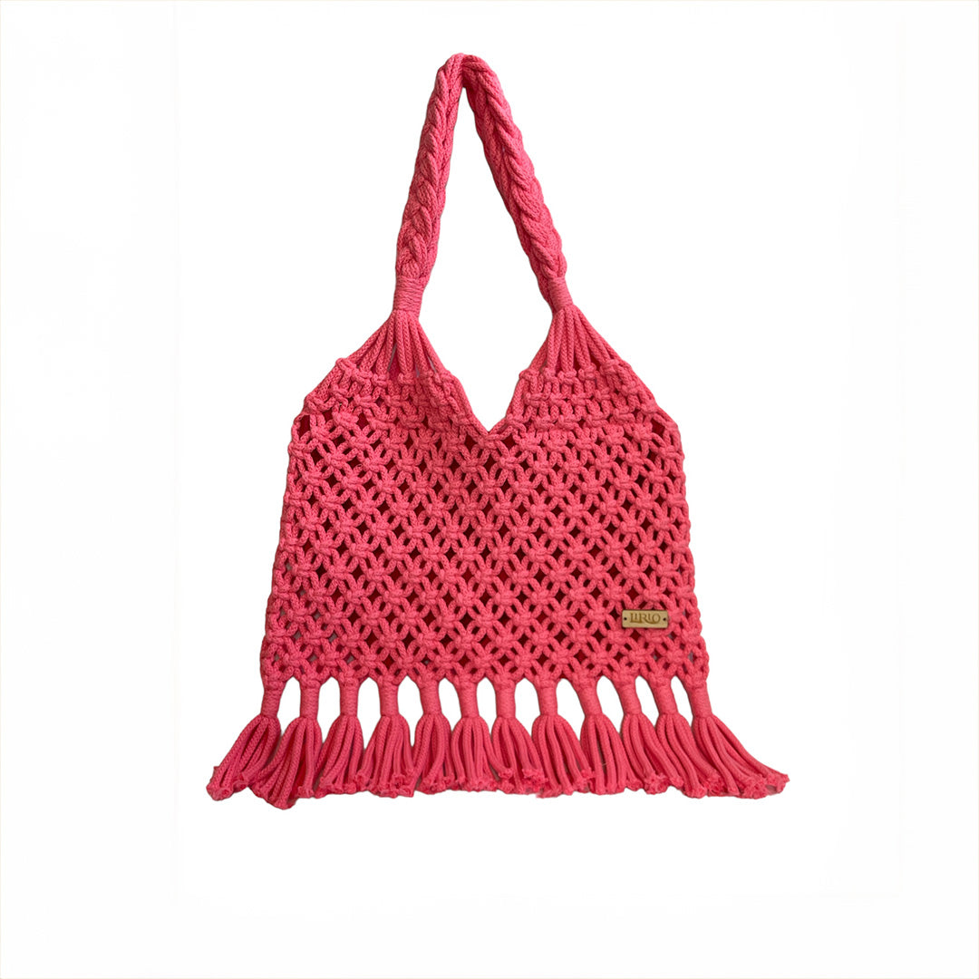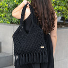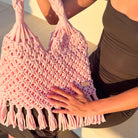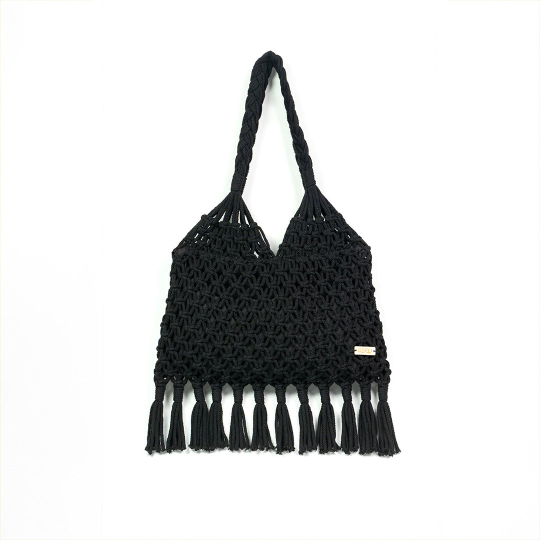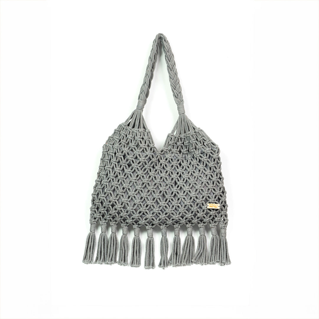 The Clara bag is a handwoven macramé handbag designed with an open diamond knot pattern and tassel details along the bottom edge. Its braided handles provide a comfortable grip, while the lightweight structure makes it easy to carry for casual outings, markets, or beach days. The handcrafted texture gives it a relaxed yet stylish look that pairs effortlessly with warm-weather outfits.